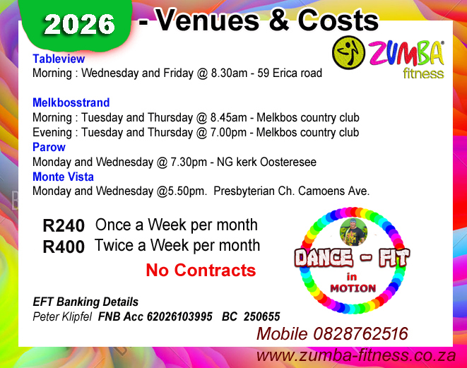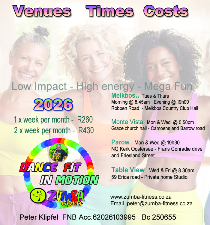 My Classes are BEGINNER Friendly. Classes in Parow, Melkbos, Monte Vista and TableView. Every DanceFit Gold class takes the “work” out of workout" by mixing low-intensity and high-intensity movements.We are low impact but high energy with routines everyone can do and not only dancers. 60min sessions that feel like a party and t leave you feeling Happy and Exhilarated. Join me today and make tomorrow smile.call 082 876 2516